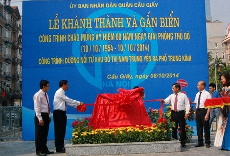 Sáng 8/10, UBND quận Cầu Giấy (TP Hà Nội) đã tổ chức gắn biển công trình tổ chức cắt băng khánh thành dự án đường nối từ khu Nam Trung Yên ra phố Trung Kính (đường Vành đai 2,5) qua khu tập thể 27/7 – công trình chào mừng kỷ niệm 60 năm Ngày Giải phóng Thủ đô (10/10/1954 – 10/10/2014).