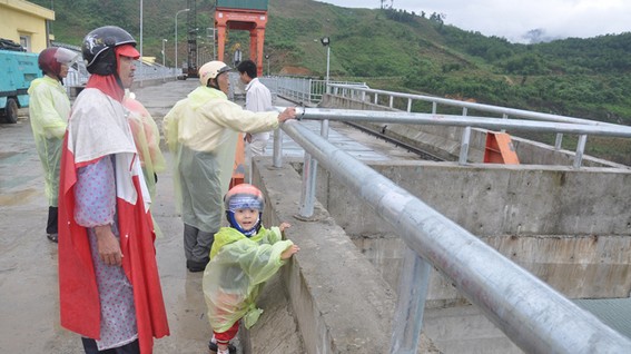 Chiều 23-10, trời vẫn tiếp tục mưa lớn tại khu vực Trà My. Nhiều người đi đường và người dân lân cận quan tâm đến đập thủy điện đã tụ tập để nghe ngóng tình hình cũng như theo dõi lượng nước về.