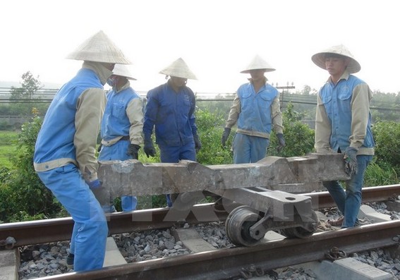Công nhân sửa chữa đường sắt Quảng Bình đang vận chuyển những thanh tàvẹt mới để thay thế những cái hư hỏng. (Ảnh: Đức Thọ/TTXVN)