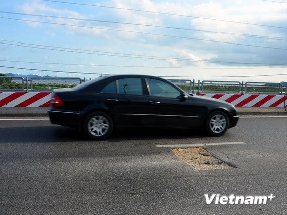 Đoạn lún, nứt đã được sửa lại nhiều lần. (Ảnh: Nguyễn Hoàng/Vietnam+)
