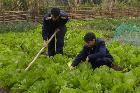 Chiến sĩ Trạm ra - đa 480 chăm sóc rau xanh.