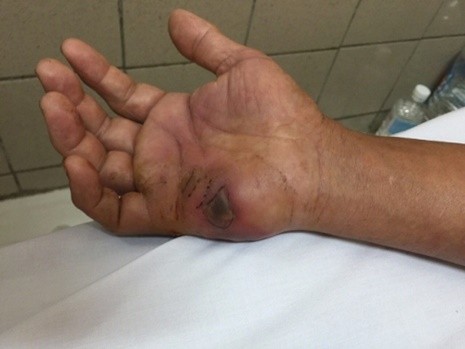 Vết cắn của rắn hổ mang chúa trên tay bệnh nhân. Ảnh: M.T