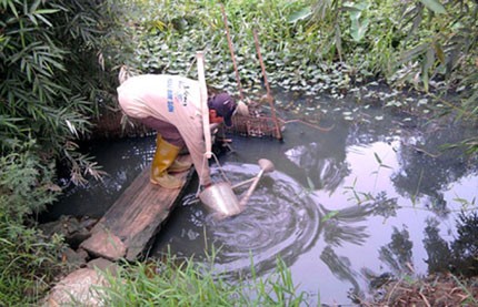 Người dân gánh nước tưới rau ở một hố hứng nước thải.