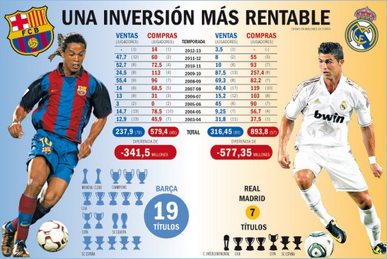 Tuy nhiên, một cách tổng quát, Real Madrid vẫn được xem là một trong những đội bóng “vung tay mạnh” của các kỳ chuyển nhượng những năm gần đây. Riêng với Barca, chính sách chuyển nhượng của CLB này ngày càng được thắt chặt, cả về ngân sách chi tiêu lẫn về cả con người. Ấy vậy mà, khi quy ra mức độ hiệu quả mà những bản hợp đồng chuyển nhượng mang về thông qua số lượng danh hiệu, Barca lại trội hơn Real. Cụ thể, kể từ mùa giải 2003-2004 đến nay, “Nhà Trắng” đã bỏ ra 893,8 triệu euro để mang về từ thị trường chuyển nhượng 57 cầu thủ; trong khi Barca với 579,4 triệu euro mang về 19 con người mới. Kết quả, Real giành được 7 danh hiệu từ thời điểm đó đến nay, và con số của Barca là 19 danh hiệu.
