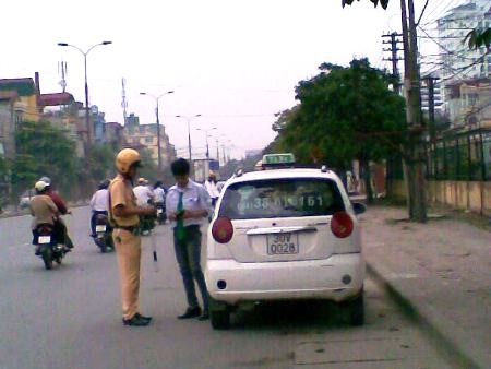 Cảnh sát giao thông kiểm tra 1 taxi trên đường Giải Phóng. Ảnh: Hữu Oanh