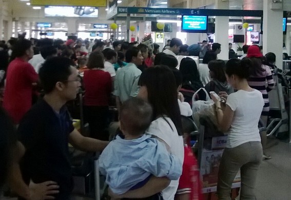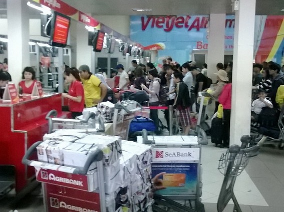 Tại đây có đến hàng trăm người xếp thành hàng dài và xoay quanh quầy làm thủ tục. Thi thoảng cũng có một số người đến quầy làm thủ tục bổ sung do trễ chuyến. Có không ít người, vì hết ghế ngồi trong khu vực sân bay đã phải ngồi bệt, vật vờ chờ đợi - điều hiếm khi gặp tại sân bay Tân Sơn Nhất trong những ngày thường.