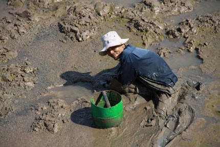 Trĩu nặng chân trần lội sình bắt cua dưới cái nắng chói chang. Ảnh: Du Nguyễn.