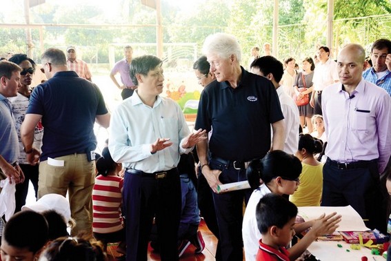 Cựu Tổng thống Bill Clinton cùng Thứ trưởng Bộ Y tế Nguyễn Thanh Long đến thăm Trung tâm Giáo dục, Lao động, Xã hội 02, ngày 18/7/2014. Ảnh: TL