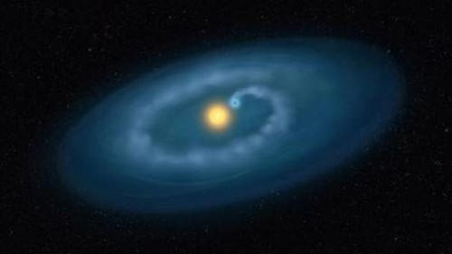 Một lượng khí lao thẳng về hướng ngôi sao, trong khi phần còn lại thoát ra ngoài không gian mở, tạo ra một bức màn ngăn chặn hầu hết bước sóng ánh sáng.