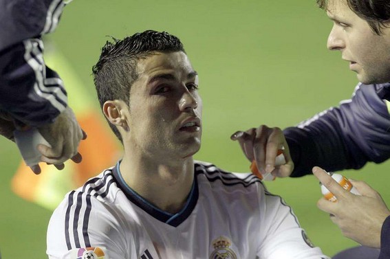 Dấu ấn đáng chú ý nhất của trận Levante - Real Madrid tại vòng 11 Liga vừa qua không phải là bàn thắng mang tính quyết định của tài năng trẻ Morata, giúp các nhà ĐKVĐ giành trọn 3 điểm trên sân khách, mà là chấn thương kinh hoàng của Ronaldo. Ngay ở phút thứ 2 của trận đấu, trong một pha nhảy lên tranh bóng, siêu sao người BĐN đã “ăn” cả cái cùi chỏ của Navarro, khiến mắt phải của CR7 chảy máu đầm đìa. Dù sau đó Ronaldo vẫn tiếp tục thi đấu và ghi bàn nhưng anh chỉ trụ được hết hiệp 1 trước khi phải rời sân vì bị giảm thị lực.