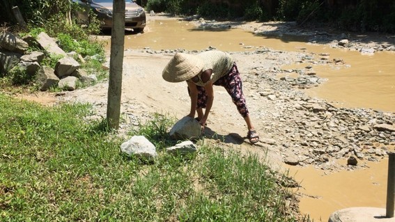Những phiến đá lớn xuất hiện giữa đường, bà Vân hằng ngày phải ra thu gom để tránh tai nạn. Ảnh Hoài Nam