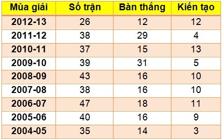 Dưới đây là thống kê về thành thích ghi bàn của Rooney tại Premier League và Champions League trong 9 mùa bóng chơi cho M.U.