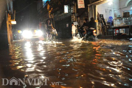 Trong khi đó, tại các phố: Thái Hà, Triều Khúc, Bùi Xương Trạch, Trường Chinh, Chùa Bộc... các phương tiện lưu thông rất khó khăn khi nước ngập cao tràn vào cả nhà dân ven đường, nhiều xe máy cũng bị chết máy giữa đường. Để an toàn và tránh rủi ro chết máy, nhiều chủ phương tiện phải chọn cách lái xe lên vỉa hè.