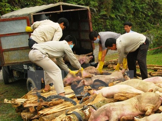 Tiêu hủy lợn bị mắc bệnh lở mồm long móng ở Hà Giang. (Ảnh: Minh Tâm/TTXVN)