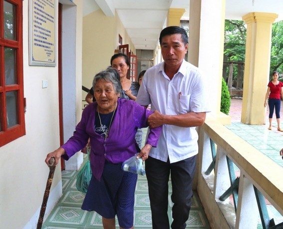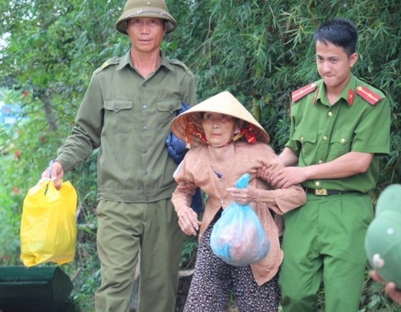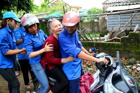 Hình ảnh cụ già được các đoàn viên thanh niên đưa vào trường Tiểu học Xuân Hội để tránh bão.
