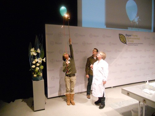 Đặng Huỳnh Mai Anh (sinh viên ĐH Ngoại thương cơ sở 2 TP.HCM) - Đại sứ môi trường Bayer Việt Nam 2012 tối 7.11 (giờ Việt Nam) đã báo cáo dự án trước Hội đồng giám khảo tại Trung tâm truyền thông Bayer (BayKomm, Đức).