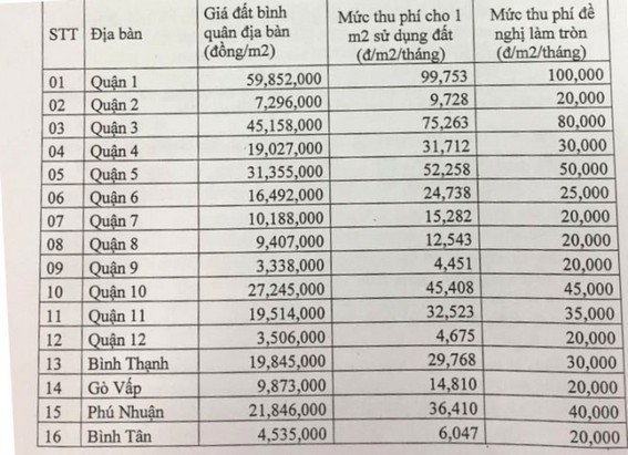 Riêng các quận 2, 7, 8, 9, 12, Gò Vấp, Bình Tân, Thủ Đức, Tân Phú, Bình Chánh, Hóc Môn, Nhà Bè, Củ Chi, Cần Giờ là 20.000 đồng/m2/tháng.