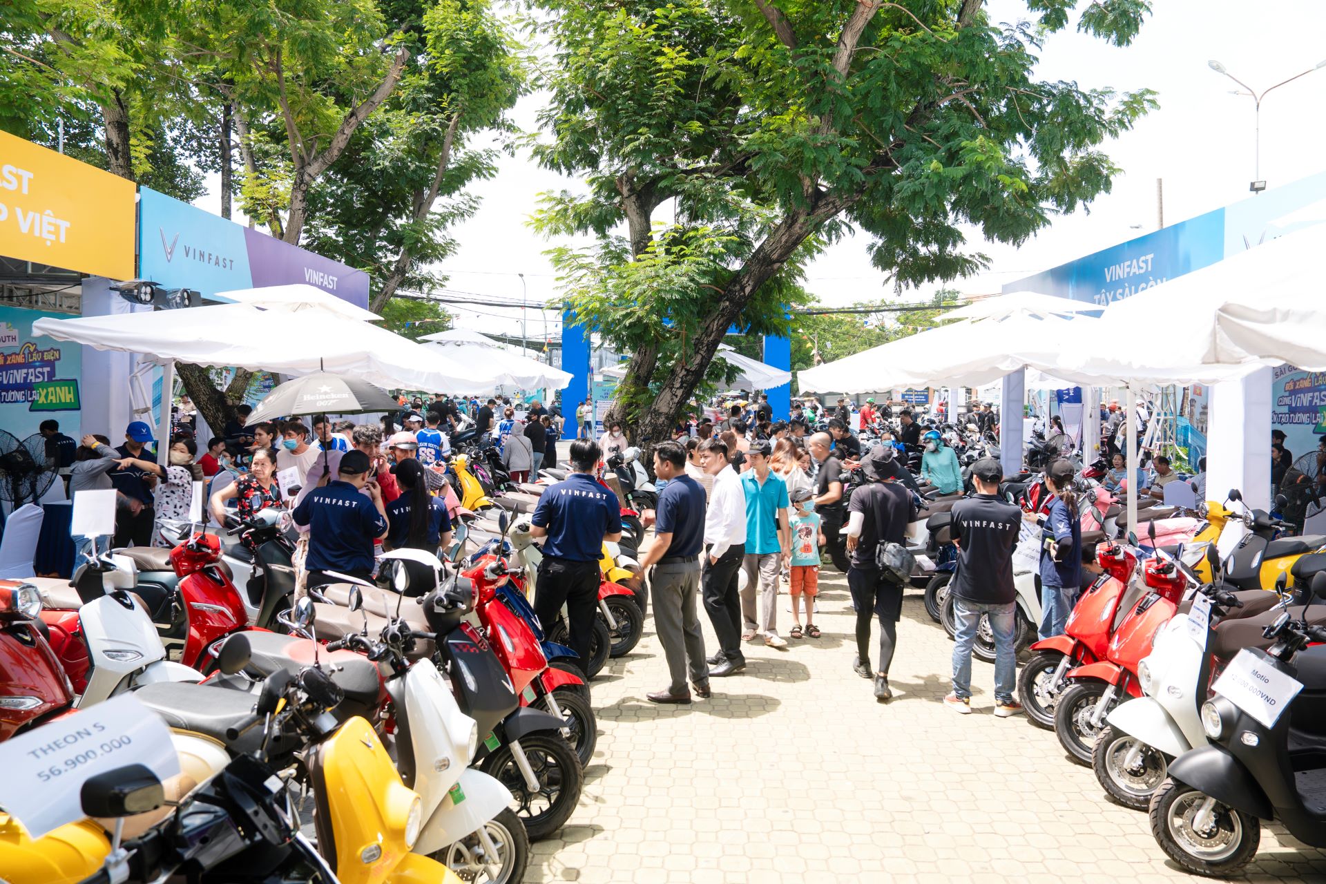 Nhiều khách hàng tại TP.HCM đến sự kiện “Đổi xăng lấy điện - Cùng VinFast kiến tạo tương lai xanh” để được trực tiếp cầm lái những mẫu xe máy VinFast mới nhất.