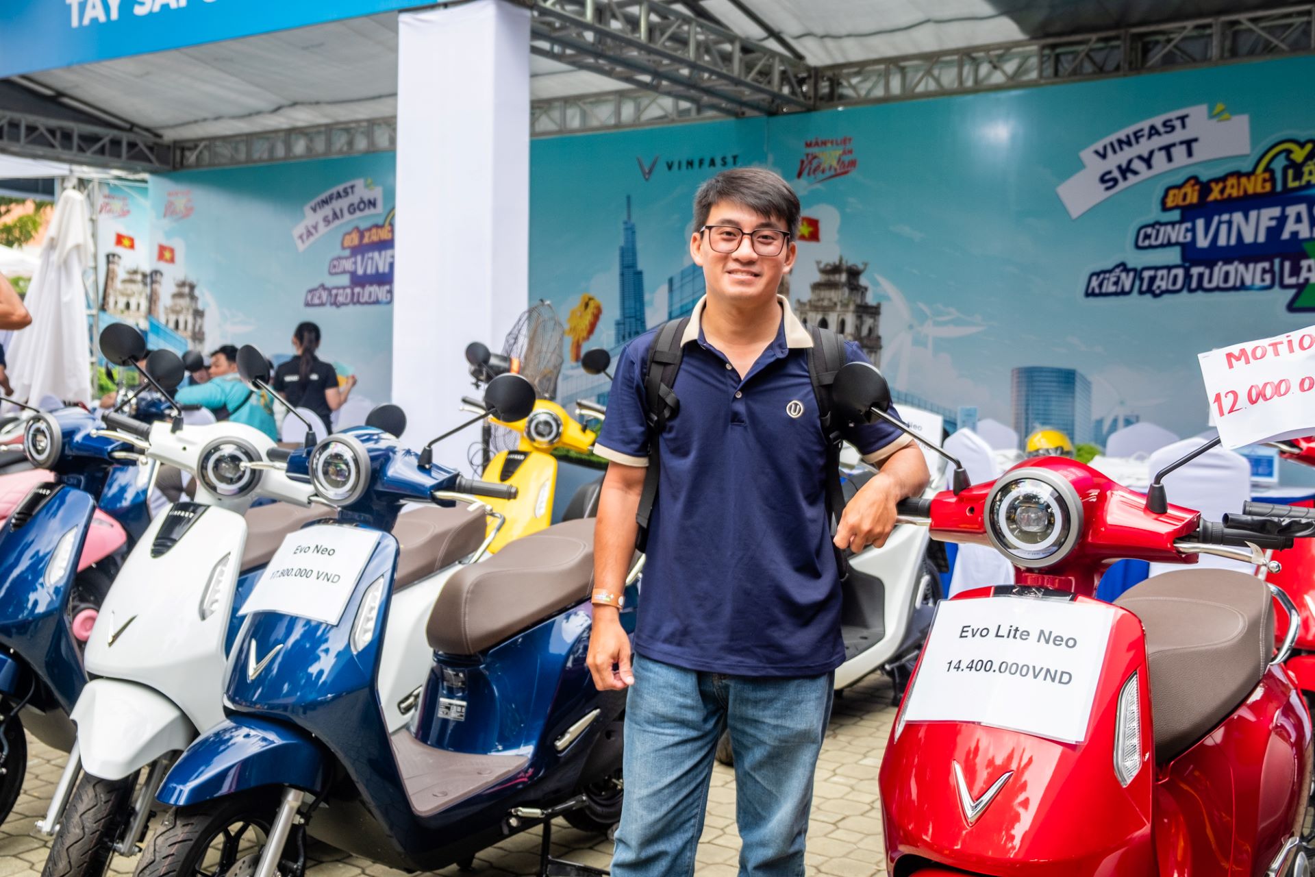 Anh Quý Bảo, sống tại TP.HCM, là một trong số đó. Tại sự kiện, anh đổi chiếc xe tay ga cũ sang VinFast Motio. “Mình chưa từng thử xe điện nhưng hôm nay đến lái thử thì thấy xe máy điện lái hay. Mình đang đi xe máy xăng thấy hơi tốn kém, mỗi ngày tốn khoảng 20.000 đồng, nên quyết định đổi sang xe điện để loại bỏ chi phí này”, anh cho biết.
