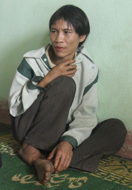 Ánh mắt sợ hãi khi thấy người lạ, ngồi co ro vào một góc nhà, anh Hồ Văn Lang, 41 tuổi, người con trai sống cùng cha trong rừng sâu biệt lập suốt hơn 40 năm qua như đang lạc vào một thế giới khác.