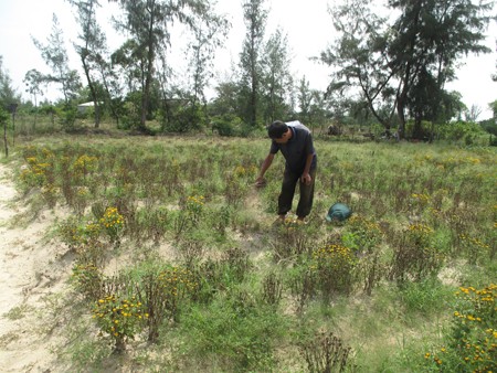 Tôi có mặt tại khu Làng Đại học Đà Nẵng vào một buổi sáng, bụi bám dày lá cây. Từ đầu đường lớn đi vào khu làng đại học, lèo tèo đôi ba quán nước vắng như chùa Bà Đanh. Đi sâu vào chút nữa thì đường toàn ổ voi, ổ gà đọng nước. Gây “ấn tượng” nhất cho ai đi qua đây là những vạt đất quanh khu làng có rất nhiều vườn hoa cúc màu đen kỳ lạ. Tôi bước vào vườn hoa của ông Mai Văn Thanh (trú phường Hòa Quý) khi ông Thanh đang lúi húi nhổ bỏ những cây cúc có màu đen.