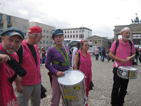 Trên đường phố gần đại lộ Brandenburg, chúng tôi gặp vợ chồng ông Hans và hàng xóm đang hào hứng “ra trận”. Ở tuổi gần 60 nhưng ông Hans không ngại ngần nhuộm tóc, nhuộm râu cổ vũ cho đội nhà. Và những bữa tiệc bóng đá ở đây không hiếm các fan già cả hăng say gõ trống cổ vũ đội nhà.