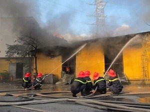 Cảnh sát PCCC tích cực dập tắt ngọn lửa. Ảnh: PV/Vietnam+