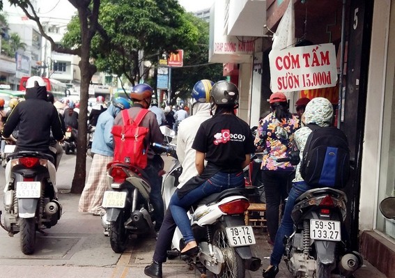 Dù đã nép vào sâu bên trong vạch sơn vàng nhưng một tiệm cơm tấm trên tuyến đường này vẫn hỗn loạn. Khách ngừng xe mua khá đông gây ùn ứ giao thông.