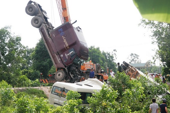 Cú tông cực mạnh đã khiến xe container lẫn xe khách rơi xuống lề đường, đã có 4 người chết, 9 người bị thương, trong đó có 3 người trong tình trạng hết sức nguy kịch.