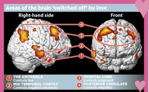 Kết quả quét não cho thấy, các khu vực kiểm soát sự sợ hãi, những cảm xúc tiêu cực hay sự suy xét và thấu cảm đã "tắt điện" khi chủ thể say đắm ai đó. Điều này giúp lý giải tại sao khi yêu, mọi người cảm thấy hạnh phúc đến như vậy với thế giới và không e sợ bất cứ điều gì sai trái.