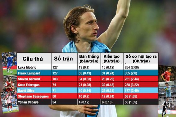 Thậm chí, tiền vệ Sunderland, Stéphane Sessègnon chỉ trong 2 mùa giải cũng có số đường kiến tạo gần ngang bằng với Luka Modric (12 so với 15). Nếu xét về tất cả các cơ hội tạo được trong suốt 4 năm qua, ngôi sao người Croatia có tổng cộng 264 đường chuyền (đạt hiệu suất 2,08 cơ hội/trận). Con số này vẫn không thể so sánh với Lampard (2,8), Fabregas (3,2) hay Gerrard, David Silva (2,4).