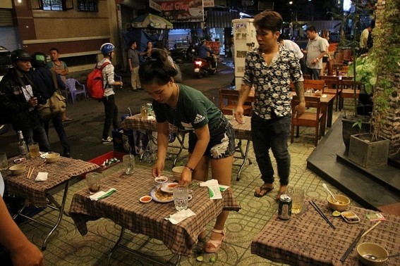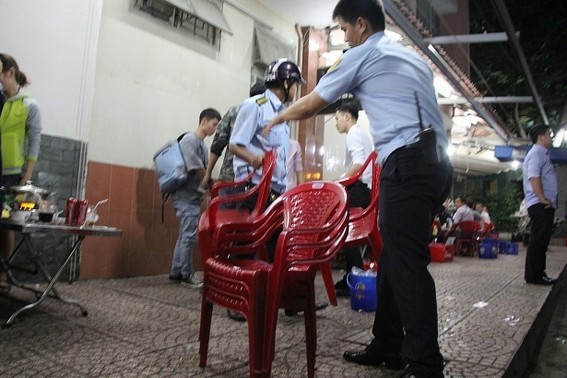 Tại quán nhậu 7 Sồi, nhân viên bày bàn ghế bán cho khách nên ập vào kiểm tra, thu số bàn ghế lấn chiếm. Khách nhậu cùng nhân viên nháo nhác khiêng bàn vào nhà.