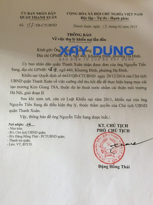 Thông báo thụ lý khiếu nghị quyết định cưỡng chế thu hồi đất của một hộ dân tại ngõ 460 Khương Đình của UBND quận Thanh Xuân.
