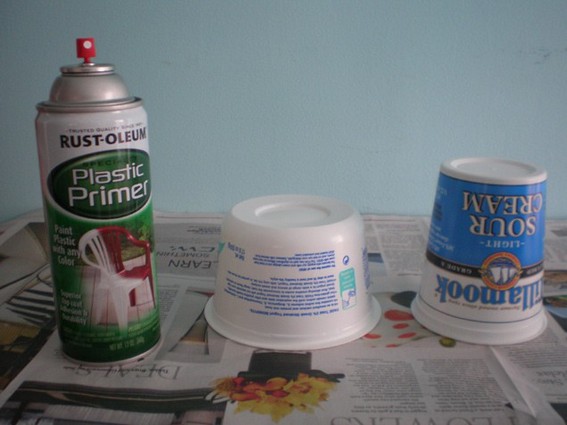 Bước đầu tiên, bạn hãy úp 2 cốc nhựa xuống dưới mặt bàn có lót giấy báo. Tiếp đó, bạn dùng bình sơn trắng để xịt đều lên 2 chiếc cốc nhựa này.