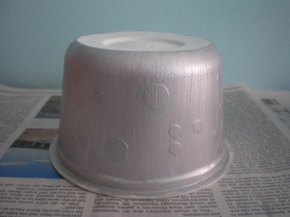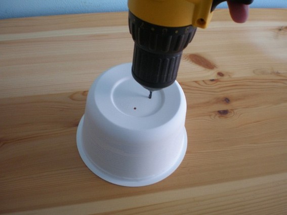 Đợi sơn khô, bạn dùng khoan để khoan dưới đáy cốc những lỗ nhỏ để cây có thể thoát nước.