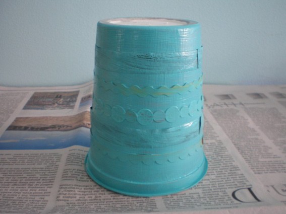 Tiếp đó, hãy dùng xốp quét thêm một lớp sơn màu xanh lên xung quanh thành chậu.