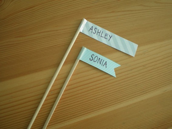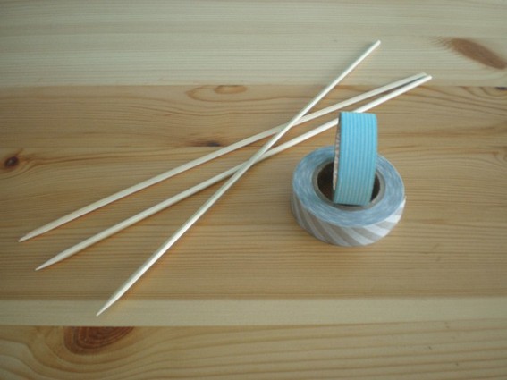 Bước tiếp theo là làm cờ cắm trang trí chậu cây. Bạn dùng que gỗ nhỏ để làm cán cờ và cắt giấy làm cờ.