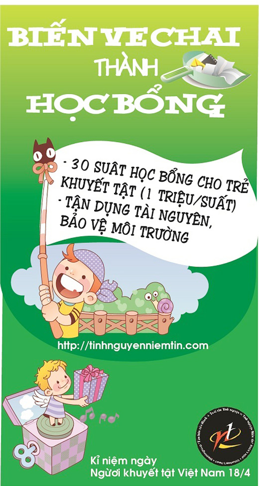 Nhân kỷ niệm ngày Người khuyết tật Việt Nam 18/4, chúng tớ (Clb tình nguyện Trẻ và nhóm tình nguyện Niềm tin) đã nghĩ ra một ý tưởng đó là: “Biến ve chai thành học bổng" nhằm đổi đồ phế thải thành tiền làm từ thiện, vừa tận dụng được tài nguyên lại bảo vệ môi trường nữa. Đó là một phong trào nhỏ mang tên “Biến ve chai thành học bổng”. Chúng tớ mong các bạn hãy cùng góp giấy vụn, đồ dùng cũ, vỏ chai, lon bia... để bán lấy tiền gây quỹ học bổng cho trẻ khuyết tật, trẻ em nghèo học giỏi.