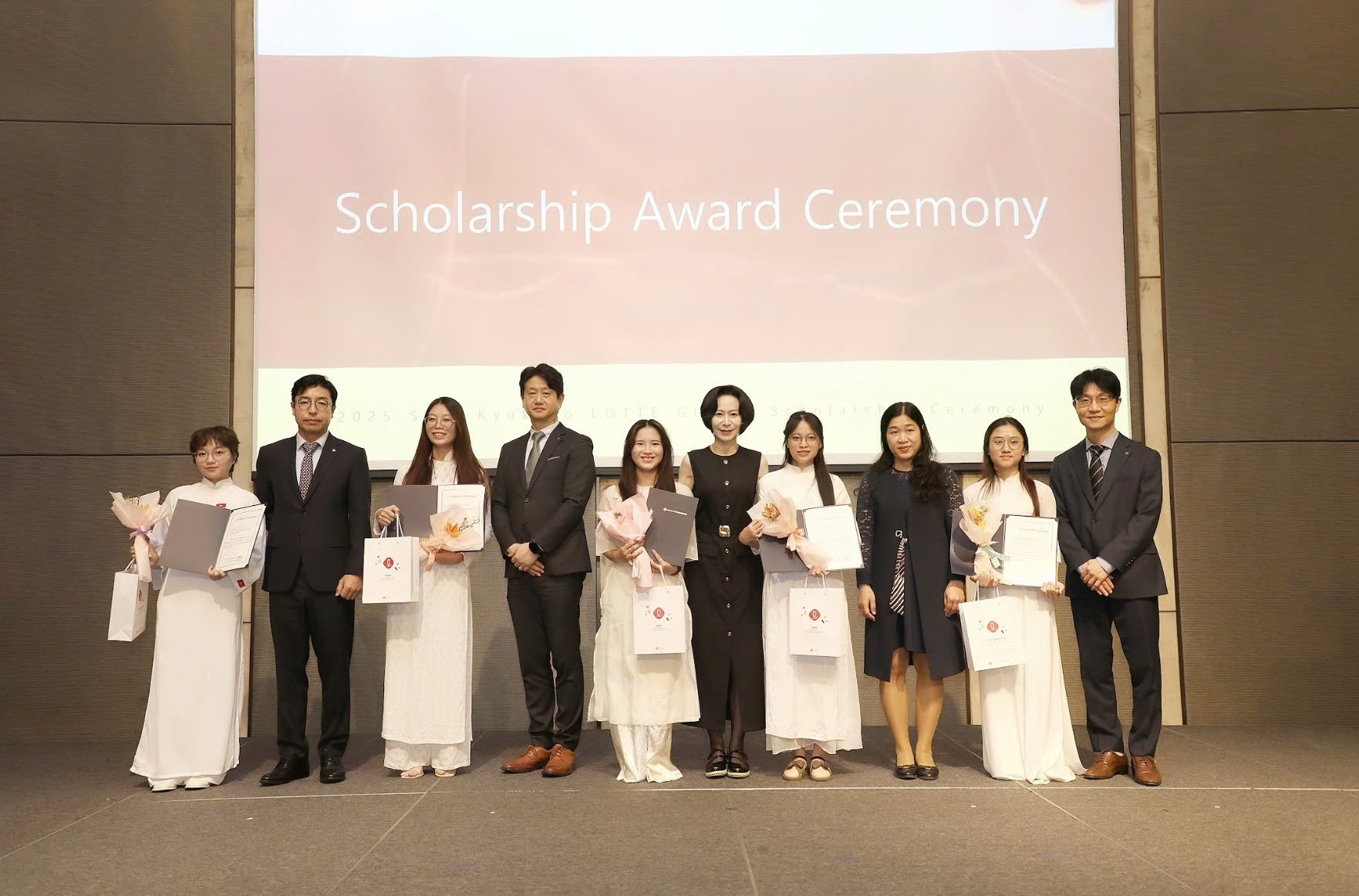 Đại diện Lotte trao chứng nhận cùng quà tặng cho sinh viên tại lễ trao học bổng