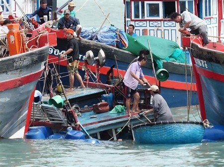 Tàu cá KH-02915-TS của ông Lê Văn Thuận (ở đường Việt Bắc, phường Vĩnh Nguyên, Nha Trang, Khánh Hòa), bị chìm tại cảng Nha Trang lúc 2 giờ 30 ngày 23-2.