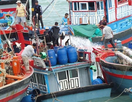 Ngư dân phải lặn sâu xuống, buộc các phao hơi cho tàu KH-02915-TS nổi dần lên, rồi buộc dây chão để 4 tàu kéo tàu này nổi hẳn lên.