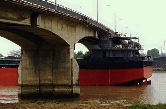 Chiếc tàu thuỷ cỡ lớn bị mắc kẹt dưới gầm cầu