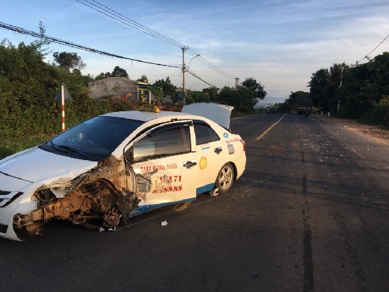 Cú tông mạnh khiến xe taxi bể nát một phần đầu, tài xế bị xây xát nhẹ.