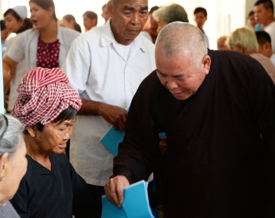 Thượng tọa Thích Đình Tánh hướng dẫn người cao tuổi làm thủ tục khám mắt
