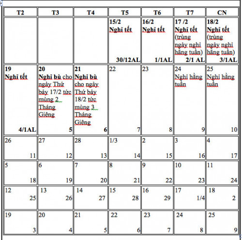 Phương án 2: Nghỉ 1 ngày trước Tết, 4 ngày sau Tết, từ ngày 15-02-2018 đến hết ngày 21-02-2018 Dương Lịch (tức ngày 30 tháng Chạp đến Mùng 6 tháng Giêng). Trong đó 1 ngày trước Tết, 4 ngày sau Tết.