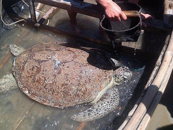 Sau khi được đưa vào bờ chăm sóc, đảm bảo sức khỏe tốt, chú rùa nặng 70kg bị mắc vào lưới của một ngư dân Thanh Hóa đã được thả về với biển khơi.