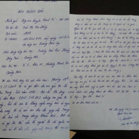 Đơn trình báo của chị Trần Thị Thu Hằng.