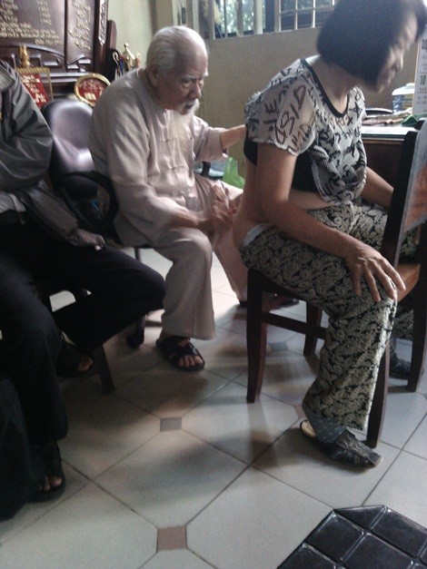Điều đáng ngạc nhiên, khi bước vào bên trong ngôi nhà, hình ảnh đầu tiên chúng tôi nhìn thấy là một ông cụ gần 80 tuổi với mái tóc bạc phơ, đang khám chữa bệnh cho một phụ nữa bị đau xương khớp.