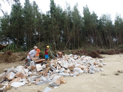 Gia đình ông Lê Văn Thắng đang thuê người kè đoạn bờ biển bị cơn bão số 6 đánh tan. Ảnh N.Hưng.