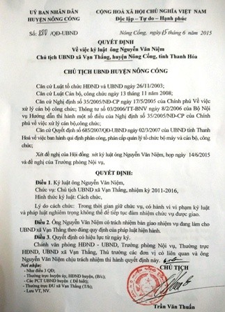Quyết định kỷ luật cách chức Chủ tịch UBND xã Vạn Thắng